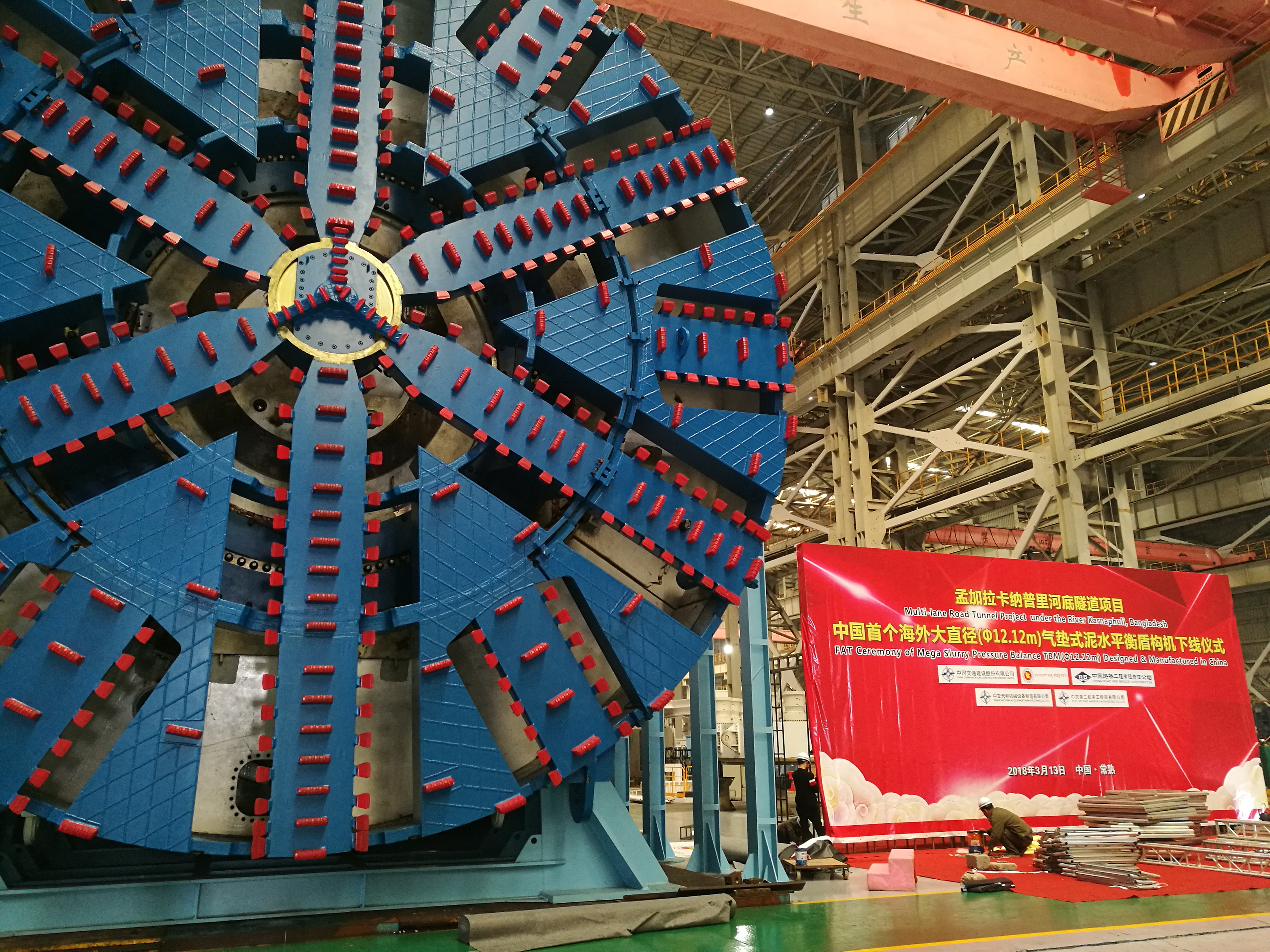 3月13日,由中交天和自主研制的中國出口海外大直徑盾構(gòu)機(jī)在江蘇常熟成功下線,盾構(gòu)機(jī)刀盤直徑達(dá)12.12米、長(zhǎng)94米、重2200余噸,是南亞地區(qū)大直徑的盾構(gòu)機(jī)。該盾構(gòu)機(jī)將用于中國在海外大的盾構(gòu)公路隧道項(xiàng)目--孟加拉卡納普里河底隧道工程,打破了由發(fā)達(dá)國家對(duì)海外超大直徑盾構(gòu)市場(chǎng)的壟斷,標(biāo)志著中國盾構(gòu)機(jī)設(shè)計(jì)研發(fā)能力達(dá)到了領(lǐng)先水平。