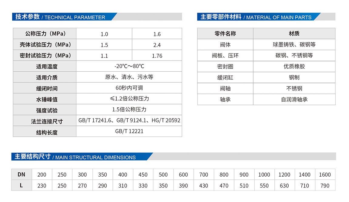 蝶形緩閉止回閥主要用于凈水、原水、污水、海水等介質(zhì)的供、排水管道上,安裝在水泵出口處,用以截?cái)嘟橘|(zhì)的回流,消除水錘,保護(hù)管道、水泵的安全運(yùn)行。其主要特點(diǎn):體形小、重量輕、結(jié)構(gòu)長度只有旋啟式止回閥的三分之一左右。帶外置阻尼油缸,緩閉性能優(yōu)良,不受管道中介質(zhì)的影響,閥瓣先速關(guān)后緩閉,可防止破環(huán)性水錘。橡膠軟密封,結(jié)構(gòu)密封性能好,耐磨損,使用壽命長。橡膠緩沖,運(yùn)行平穩(wěn),無震動及噪音,比老式止回閥流阻小,有明顯的節(jié)能效果。